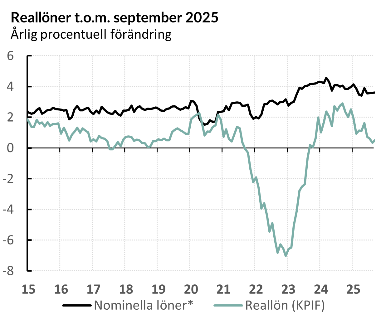 I diagrammet nedan visas utvecklingen för löner och för löner minus inflation, det vill säga reallönerna.