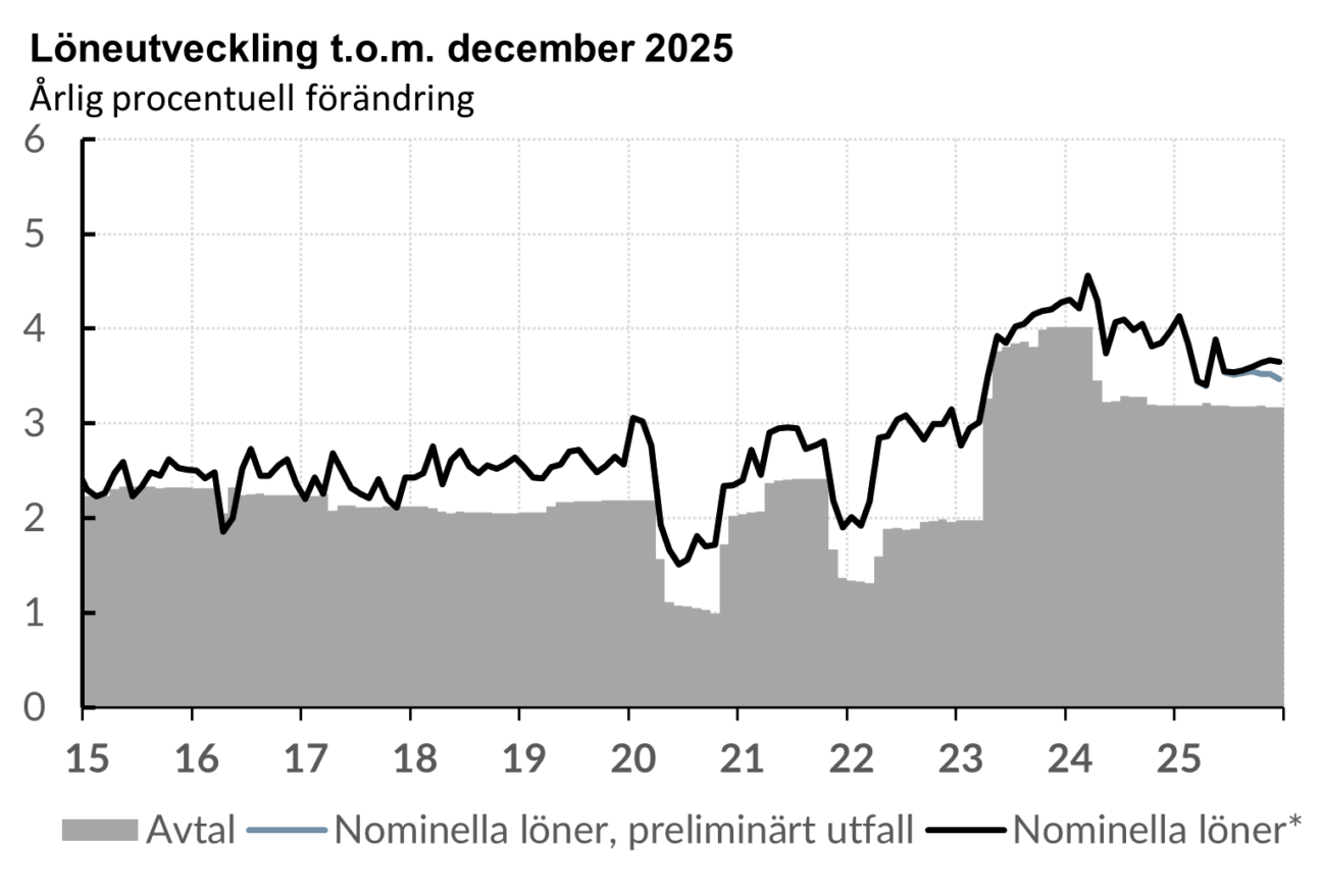 I diagrammet nedan visas utvecklingen för löner och för löner minus inflation, det vill säga reallönerna.