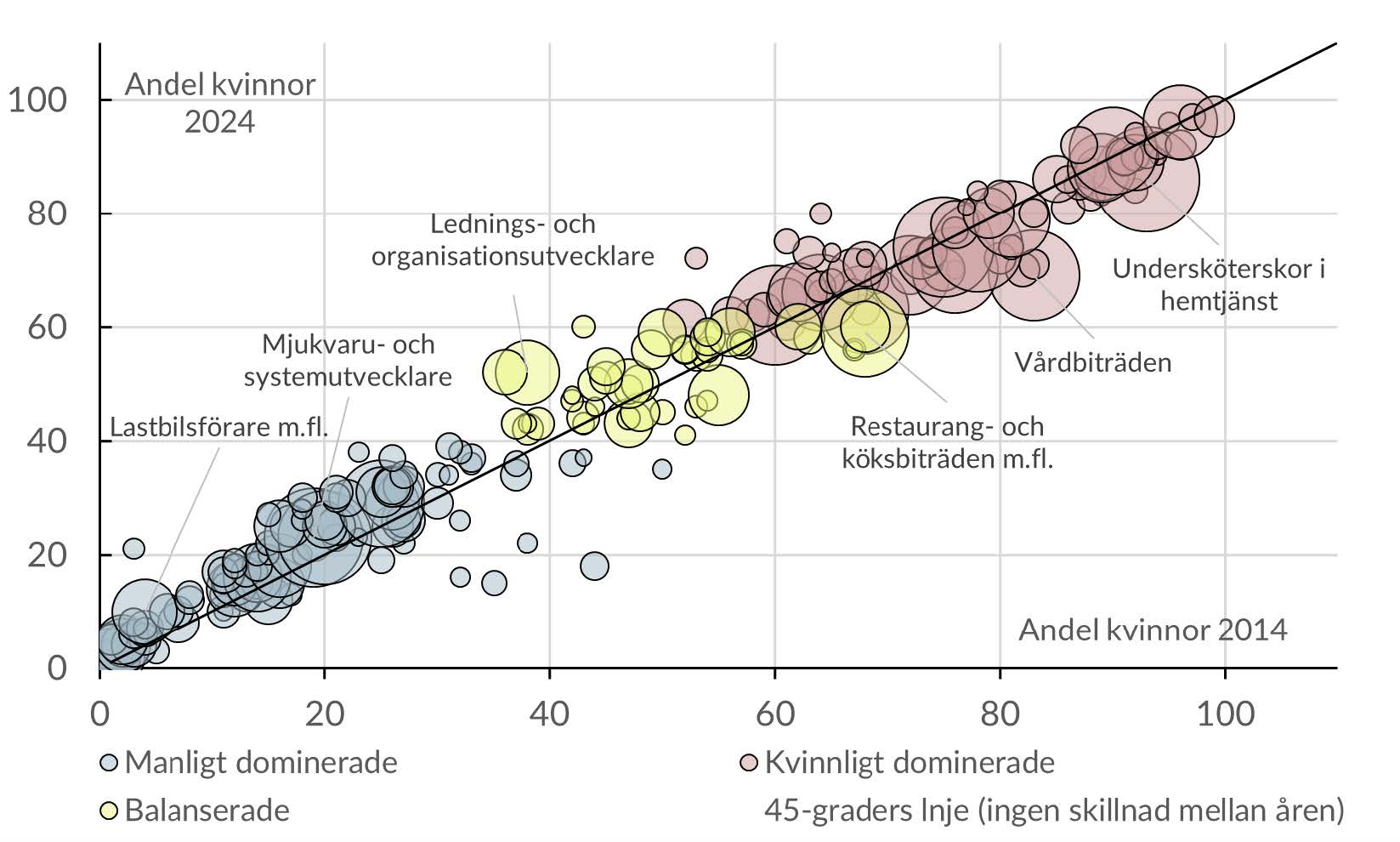 I de yrken som ligger över hjälplinjen har andelen kvinnor ökat sedan 2014. Omvänt så har andelen kvinnor minskat i de yrken som ligger under linjen. Även om bilden inte är helt entydig så visar diagrammet att andelen kvinnor ökat i merparten av mansdominerade yrken (de flesta blåa bubblorna ligger över linjen). På motsvarande sätt har andelen kvinnor minskat i de flesta kvinnodominerade yrken (de flesta röda bubblorna ligger under linjen).